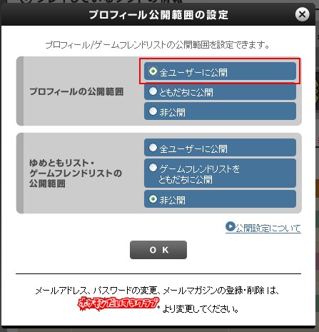 ちなみに「ゆめとも」をつくるためにはプロフィールを公開設定にしておく必要があるそうなので、簡単に公開設定の手順を画像とともに書き記しておきます。