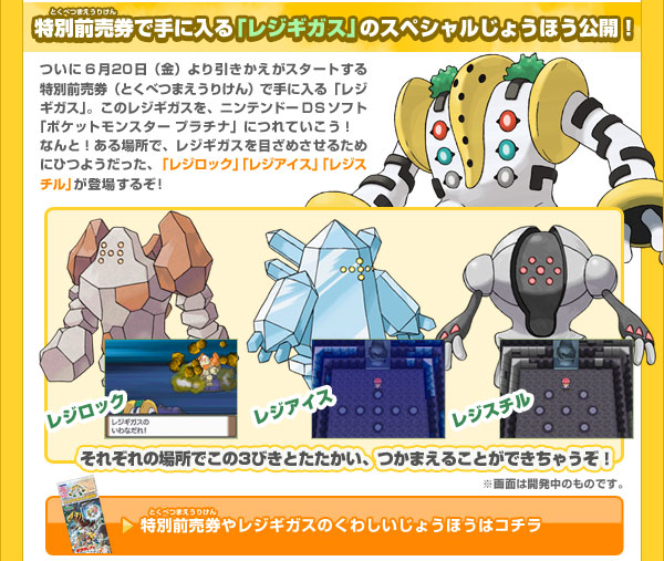 特別前売り券付属の引換券で貰えるレジギガスを今秋発売予定の「ポケットモンスター プラチナ」につれていくと、レジロック、レジアイス、レジスチルの3匹に出会える!そうです。