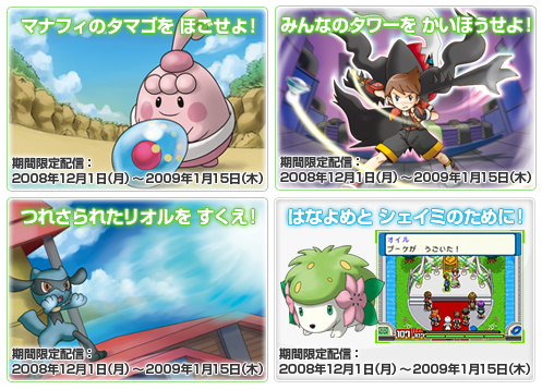 配信が終了した上記の3つのスペシャルミッションと1つのエクストラミッションの再配信が決定しました。配信期間は先日書いた「メンバーズカードをもらってダークライをゲットしよう!」の配信と同期間の2008年12月1日(月)から2009年1月15日(木)です。